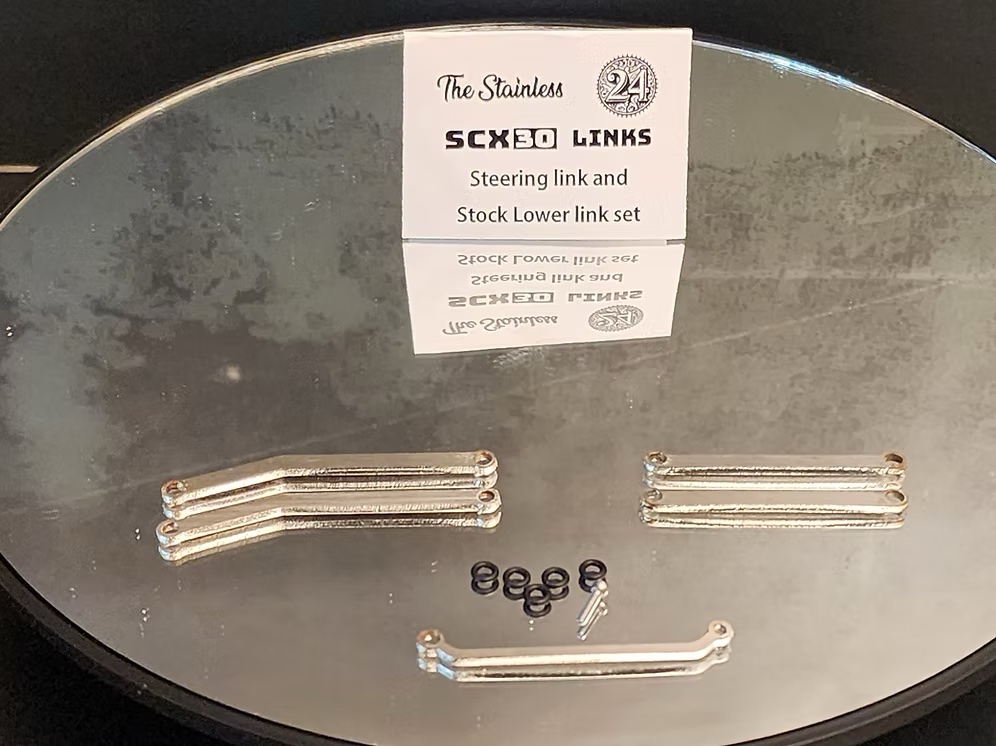 STAINLESS24のステンレス製のSCX30用リンクセットで、ホイールベース+6mmや+9mm、フロントスキッドにする組み合わせなど、他ブランドで販売していないバリエーションがあります。