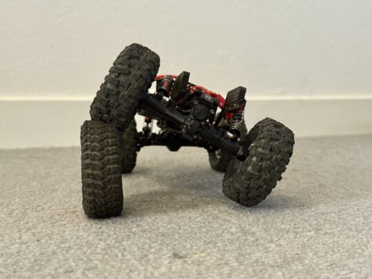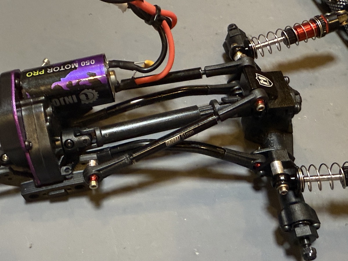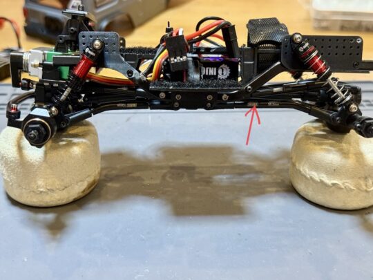 先ほどのスキッドプレート交換だけでは完全に干渉を解消できなかったので、以前に使っていたMEUSのISOアクスルに付属していたリアリンクライザーも装着したら干渉がなくなりました。