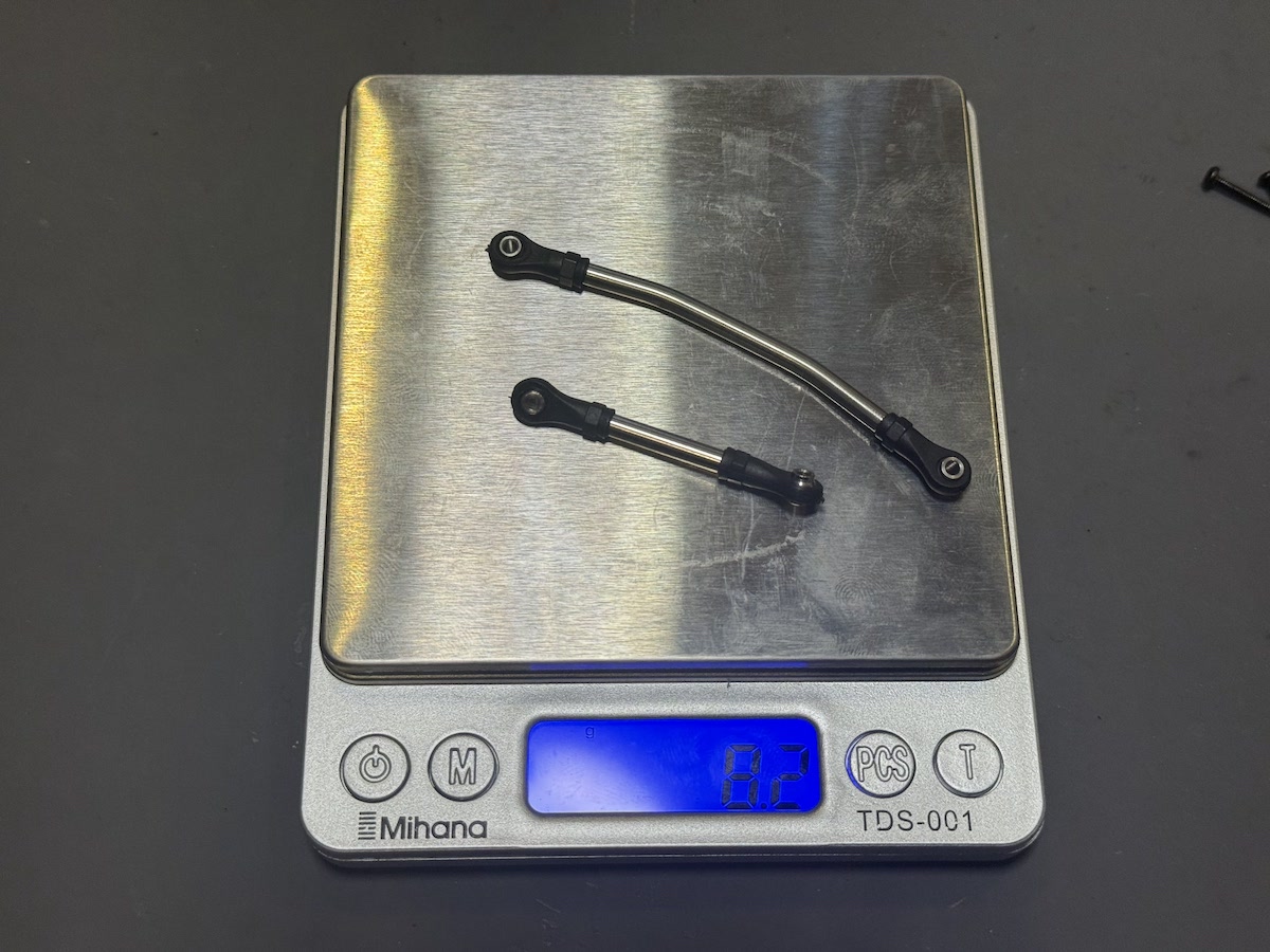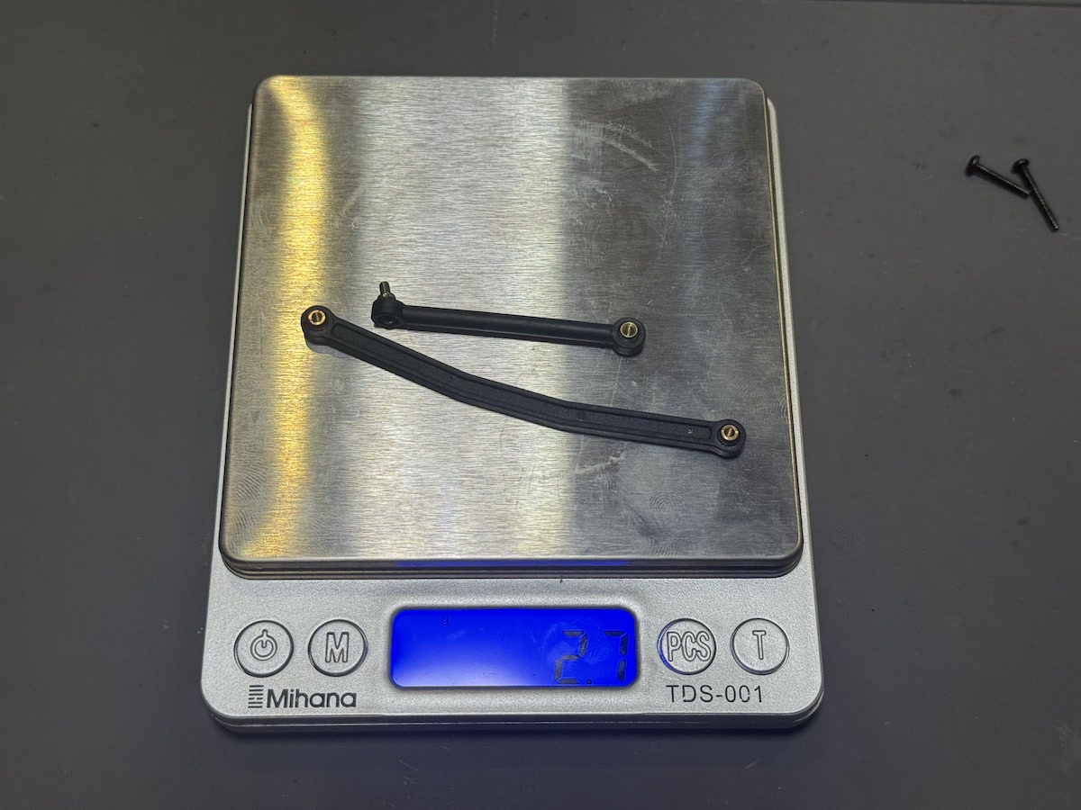 ノーマルのステアリングリンクとサーボリンクのセットは2.7g、それに対してオプションパーツの方は8.2gと5.5gの低重心化ができました。