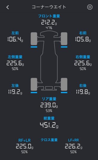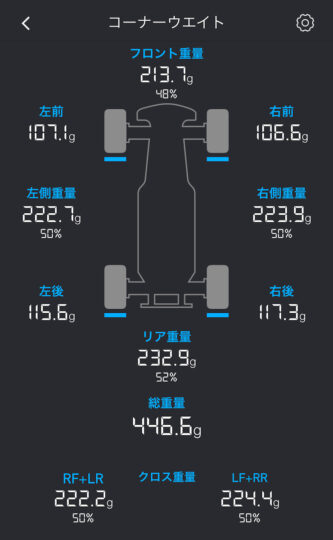 フロント側のウエイトバランスが47% → 48%と更にフロントバイアスに調整できました。