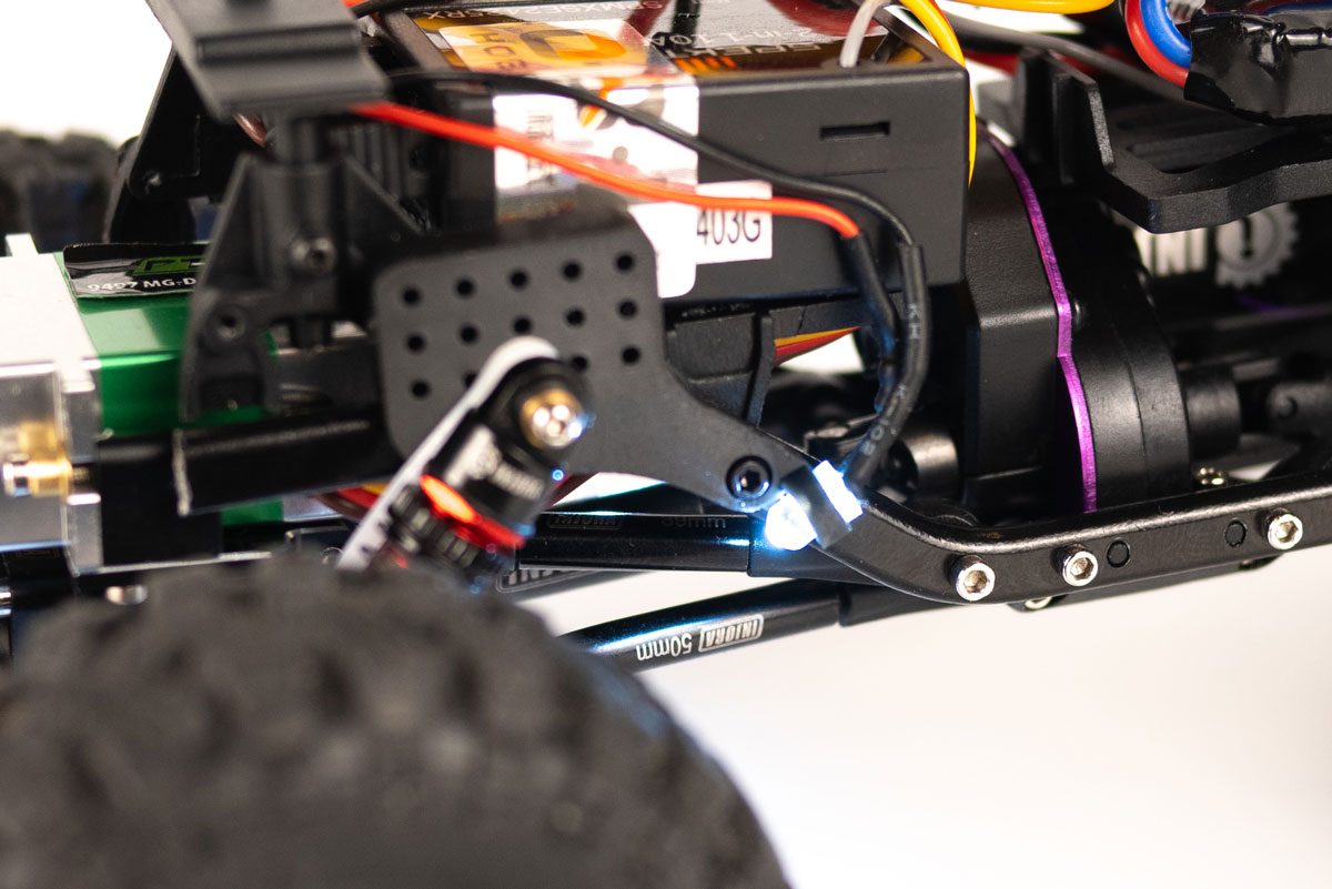 “MPST”のもうひとつの特徴は、フロントのショックタワーにはLEDライト用のブラケットが備わっており、ノーマルバンパーに装着されているLEDをロックライトとして再利用することができます。